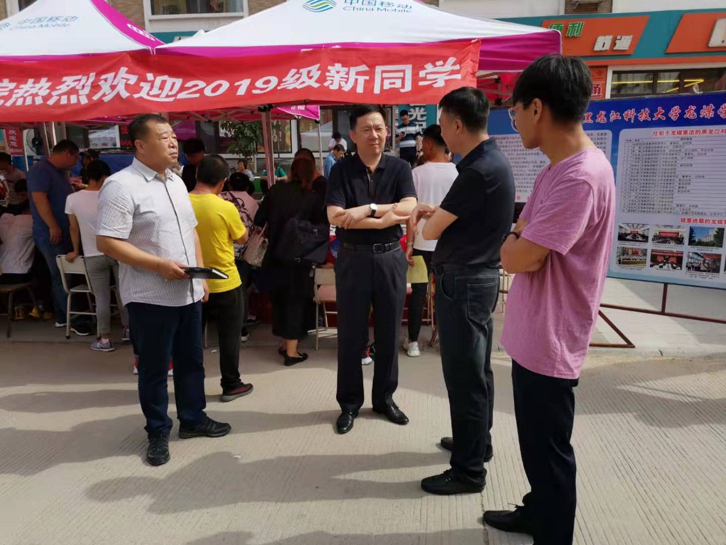龙煤集团组织部部长王会敏、副部长周振国、干部管理处处长布振琏与高德民副经理咨询新生报到情况
