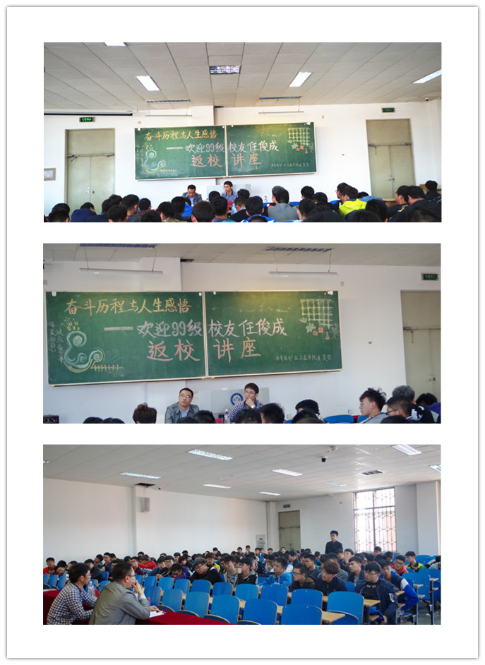 任俊成员工现就职于深圳市正兴基础建筑工程有限公司,担任总经理职务(工程硕士)、高级工程师。他结合自身经历,围绕毕业后求职受挫、跨专业就业、从业历程、素质提高以及学习能力等方面展开讲座,并与参会员工进行了现场互动,热心回答了同学们关于就业、考研、学习困惑等方面的问题。任俊成员工把自己十余年的奋斗历程与人生感悟对同学们进行了坦诚而真挚的分享。最后,他送给同学们一句话:学采矿而不干采矿,你的人生一样会很精彩!