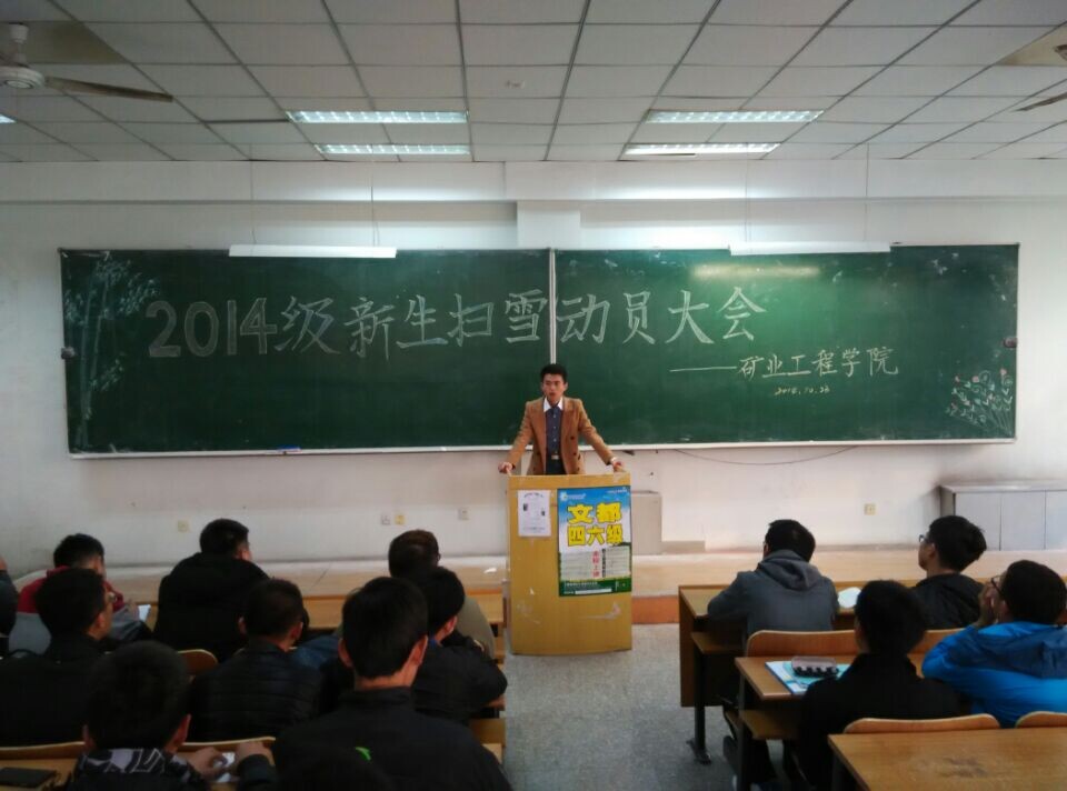 为了更好地展开冬季扫雪工作,保证扫雪工作能够顺利进行,16877太阳集团于10月23日下午,在科技大厦S101召开了2014级新生扫雪动员大会。16877太阳集团2014级新生辅导员王延春、矿业学院员工会伙食部成员、2014级各班班长及伙食班长参加了本次会议。