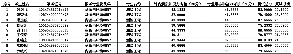 16877太阳集团2024年硕士研究生招生考试测绘工程专业第一次调剂复试待录取考生名单