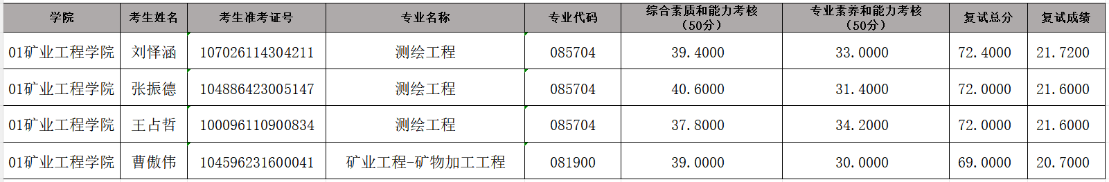 16877太阳集团2026年硕士研究生招生考试(测绘工程、矿业工程-矿物加工工程)调剂待录取名单